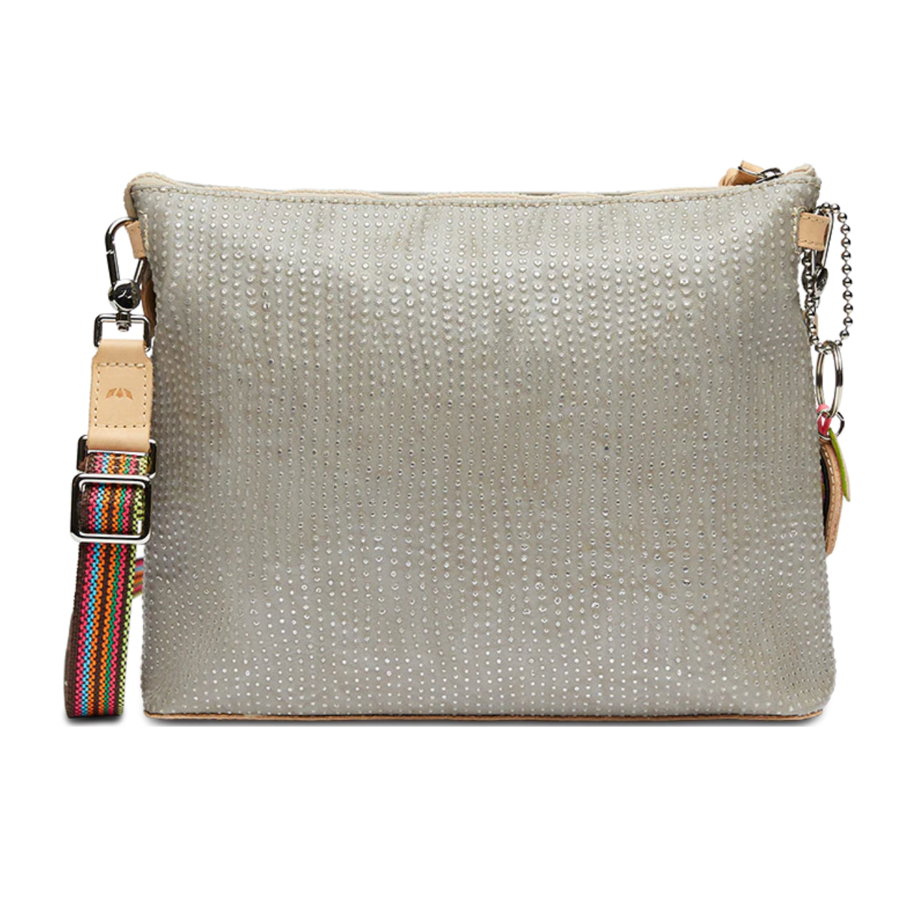- Includes detachable and adjustable woven crossbody strap