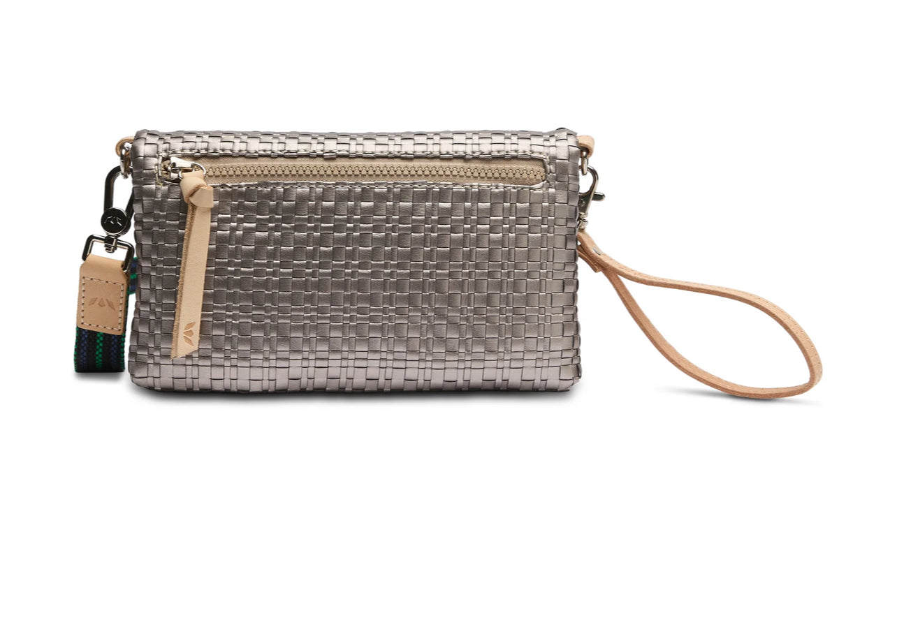 - Included detachable wristlet strap and adjustable woven crossbody strap
