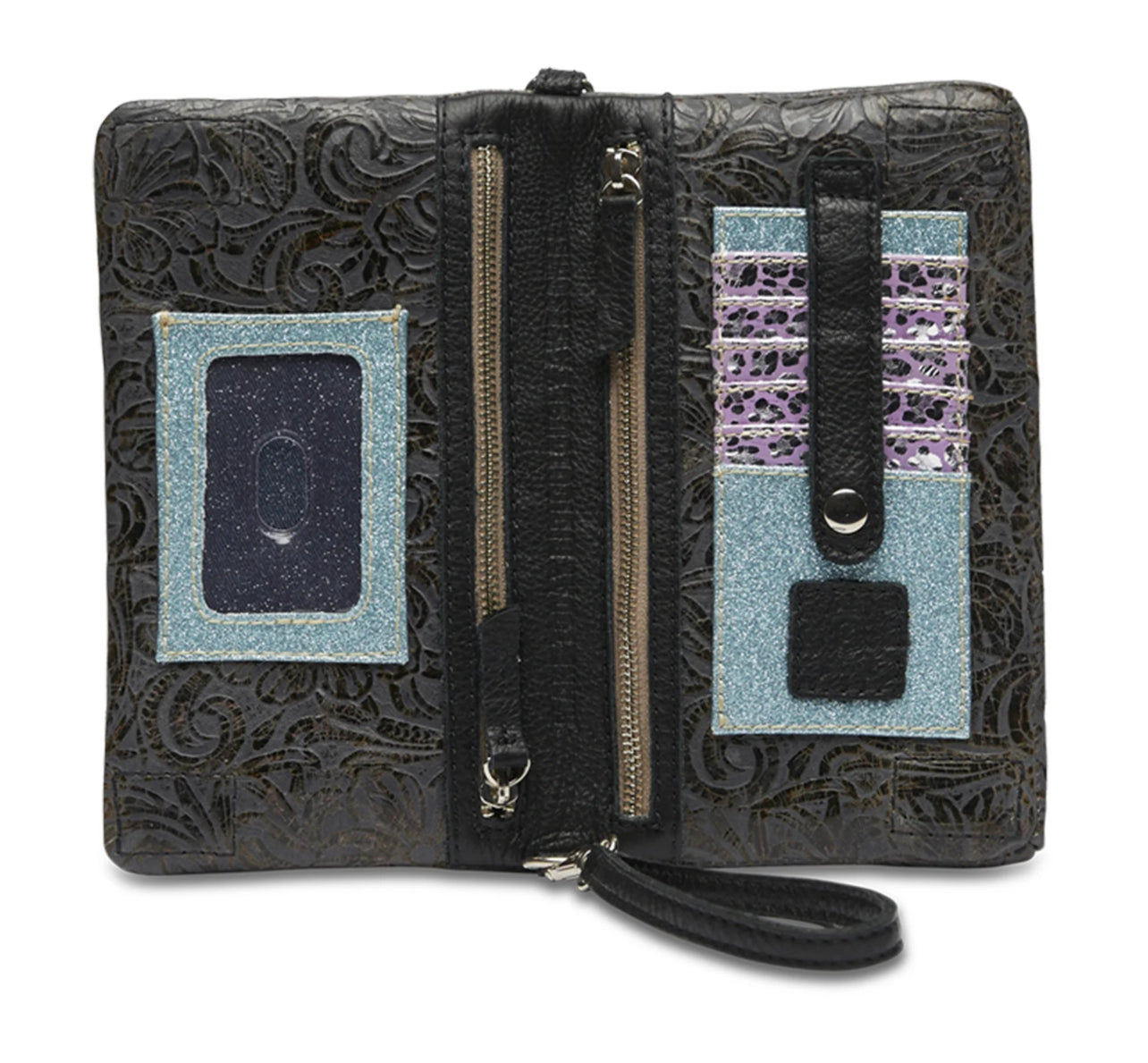 - Included detachable wristlet strap and adjustable woven crossbody strap