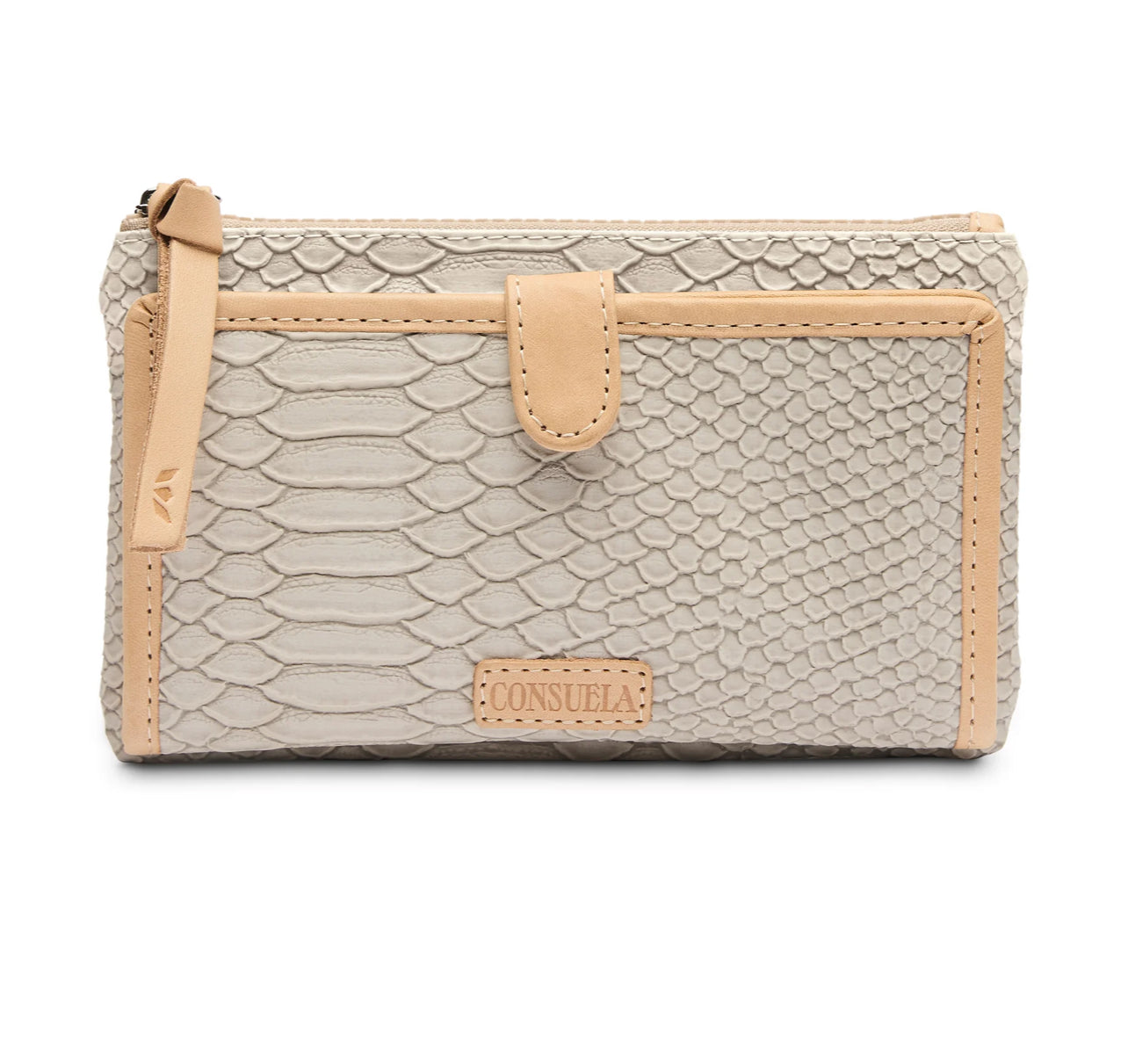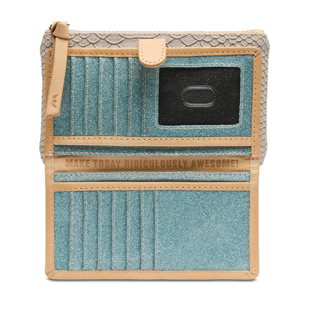 Our Slim Wallet carries cards and cash without weighing you down. Open the snap closure to reveal an ID window pocket, 12 card slots, and 4 slide pocket compartments in this versatile and colorful wallet.
